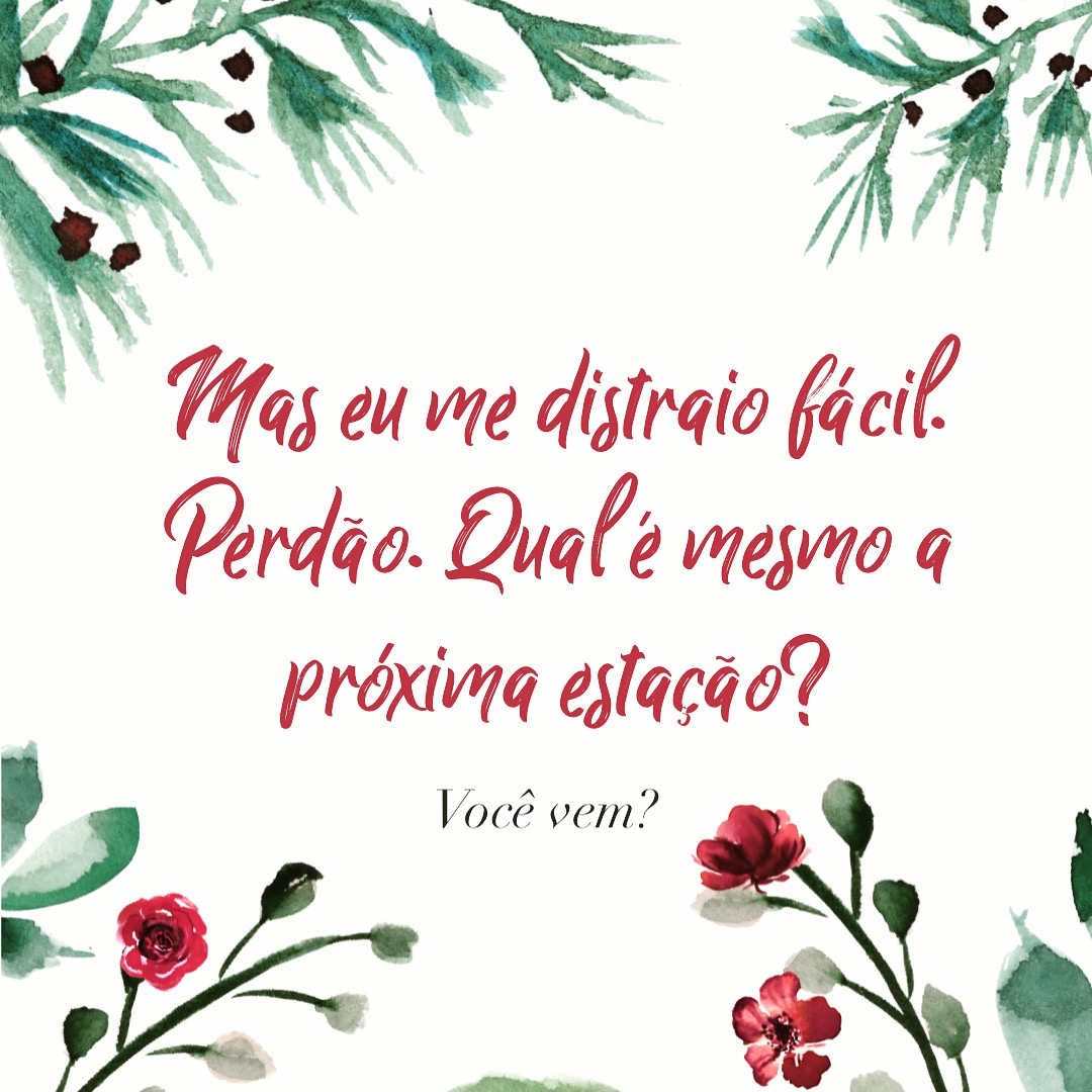 Eu desço uma estação antes do destino, sem pressa. Sentir o calçar. Em cada pulsar. Fecho os olhos. Presente. Se sente. Aqui do meu lado. Te faço cafuné. Pois é. Num piscar de olhos. Eu só queria dizer que amo esses frios na barriga. E essas viagens. Mas eu me distraio fácil. Perdão. Qual é mesmo a próxima estação? Que viagem! E sigo porque amor é coragem. E quando falam de sinais, eu sei que eles agem. Eu reajo. Viajo. Ali né? Ah, esses encontros e desencontros… Até já!