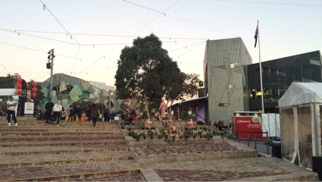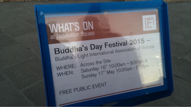 Me encontrei com uma amiga e fomos paradas pelo semáforo da curiosidade logo na cidade pertinho da biblioteca, tinha um grupo de street dance animaaaal que me deu saudade dos meus sábados de aula de dança. Que energia gostosa! Passando pela Federation Square, surpresa! Buddha’s Day Festival 2015, tudo decoradinho e cheio de significados, comida e cor.