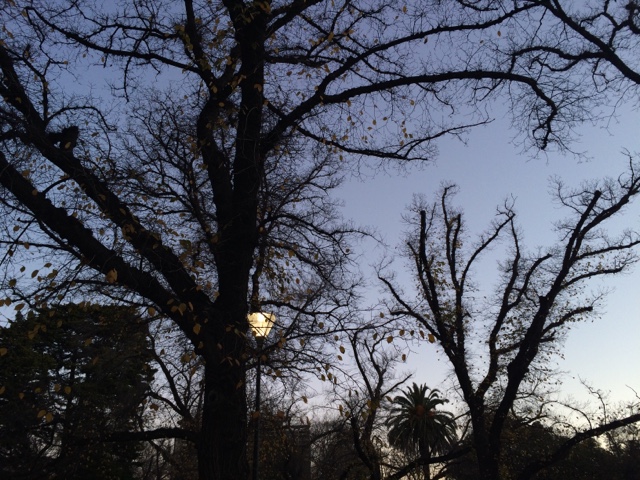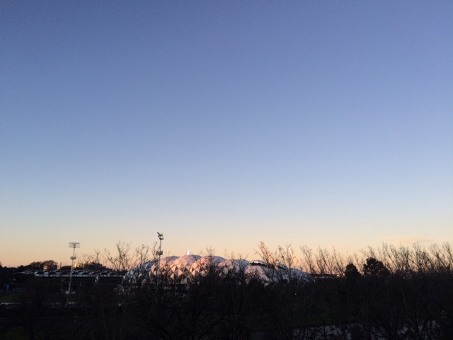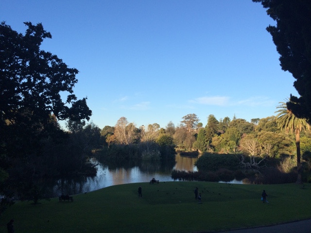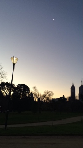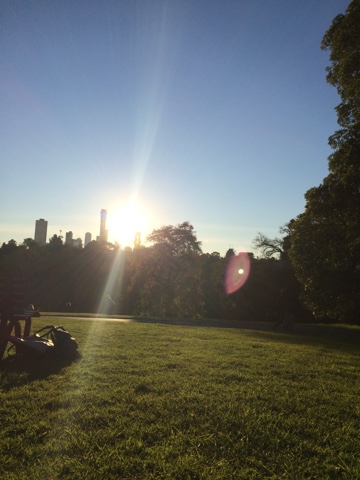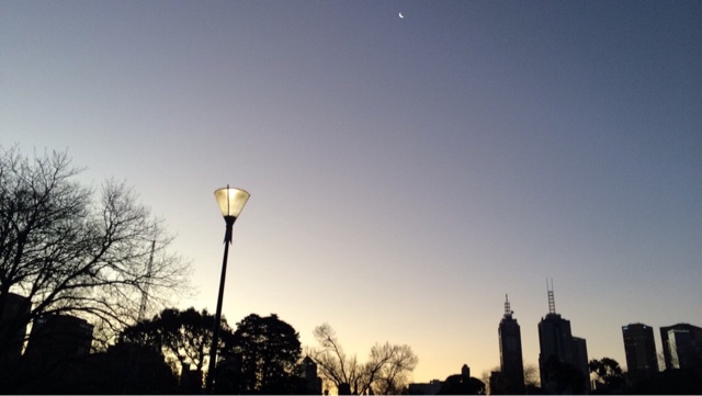 Depois da noite mais longa do ano, acabei indo dormir às 7 am, quando o sono me colocou pra dormir. Vi a noite virar dia. O céu apagando as luzes da cidade e dando luz às ruas. Bom dia! Obrigada! Quando acordei, eu não queria só azul, precisava ver verde, se é que me entende. Queria sol na pele, o dia estava favorável. É como disse, aqui a gente aprende a não desperdiçar um dia se quer, até porque não sabemos como será depois, o sol não tem visita marcada, sempre chega de surpresa, não gosto de ser má anfritriã. Fui pro Royal Botanic Garden que descobri ficar a uns vinte minutos andando daqui de casa. Uma das coisas que mais gosto daqui é isso. É muito fácil o ir e vir. E fui. Teve sol, teve verde e o céu estava num azulão lindo. Mesmo que o frio se aproximasse e ganhasse força, o dia não perdeu seu encanto. E ainda eu, que sempre disse odiar frio, começo a gostar dele. Por vista, o pôr do sol. O laranja meio rosado foram se misturando ao azul. Parecia que alguém estava a pintar aquilo. A obra estava sendo feita naquele instante. E eu assistia atenta. Uma palavra que defina uma paixão? Arte! O que? Tudo! Meu tudo! Obrigada! As luzes começaram a se acender de novo. Eu conseguiria encher mais uma bateria só com essa energia.